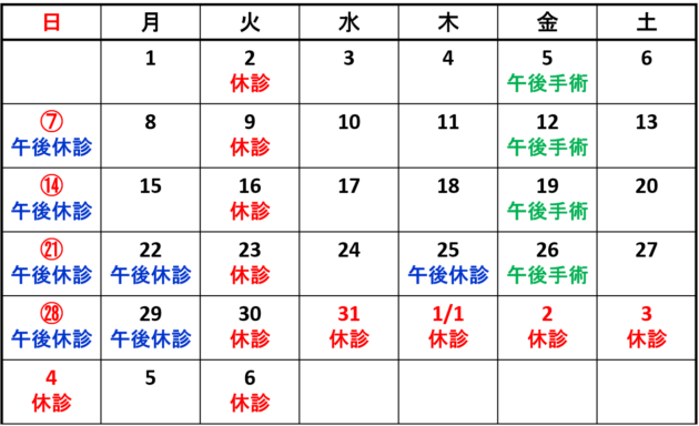 ・副院長の眼科診察は午前中のみとなります。日付に〇がある日は副院長不在です。